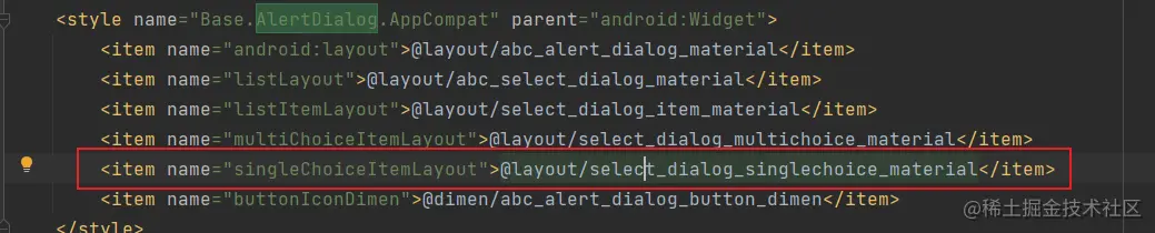 就可以看到在这里设置颜色,所以这个 android:textColorAlertDialogListItem 就是我们要的东西。