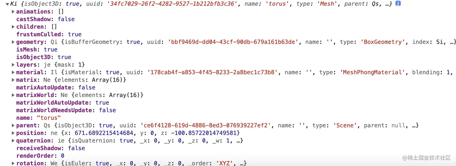 | getObjectByName | 该方法可以获得特地名字的对象。接受name和rescursive两个参数。当rescursive为true时,在调用者所有后代子元素上查找。 | console.log(scene.getObjectByName('torus'), 222); | |