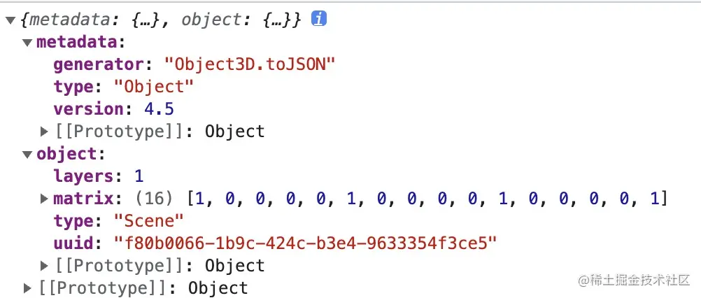| toJSON | 该方法可以将scene对象转换为 three.js JSON Object/Scene format(three.js JSON 物体/场景格式)。 | console.log(scene.toJSON()); | 目前还不晓得它有啥用途。 |
