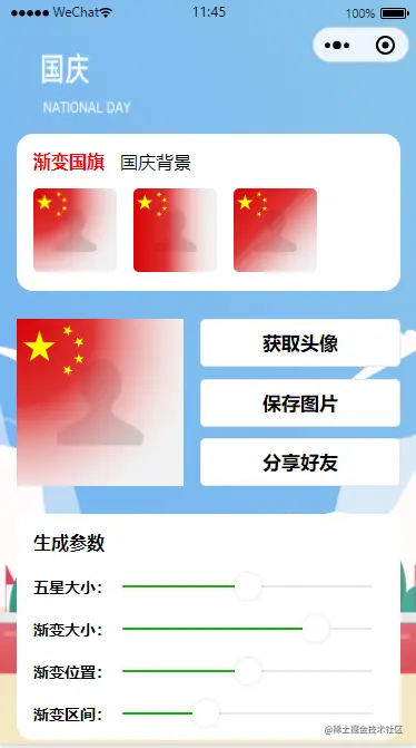 功能分出两个部分,第一个是渐变国旗,可以通过下面的参数调整生成的小程序。第二种就是常用的使用背景图和头像贴图。