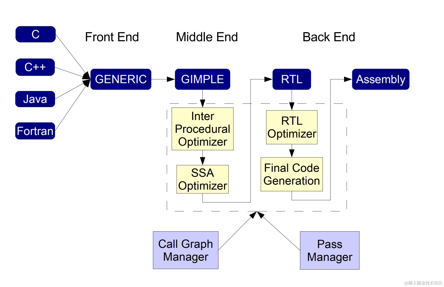 1987年3月22日理查德·马修·斯托曼发布GCC第一个beta测试版(当时被称为GNU C Compiler,也就是GNU C编译器)。1999年4月,经过长时间的谈判EGCS最终成为GCC(此时改名为GNU Compiler Collection,GNU 编译器集合)的官方版本,并于当年7月31号发布统一后的第一个GCC版本2.95,之后由GCC指导委员会的指导下不断迭代更新。GCC中编译器也遵循三段式设计(如下图中所示,详见GCC内部课程),有前端、中端以及后端。