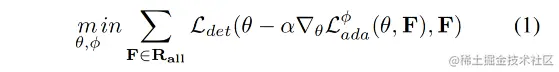 直观地说,在环境的一个特定局部区域 (无论是房间、建筑物还是场景) 中训练目标检测器可以提高检测器在该区域其他附近帧上的性能,因为这些环境 (实际上是自然界) 是连续的。通过经验结果证实了这种直觉,因此将此任务表述为一个元学习问题,其中交互式目标检测任务 T 的每个实例都代表一个要适应的新任务。在训练时,这种抽象很有效,因为咱们可以将 F 中的每个帧及其对应的 ground truth 标签作为一个任务示例,并应用 MAML 算法的一个版本。然而在测试时,这种方法是不可行的,因为咱们没有得到任何帧的标签。咱们可以通过添加另外一个损失来克服这个问题,这个损失不是基于标签的,而是基于 F 中的帧。这个损失可以是手工设计的,也可以是学习的。学习损失没有明确的目标,并通过趋向最小化这种损失来提高模型的检测能力。因此,提出的模型的学习目标是 公式(1)。