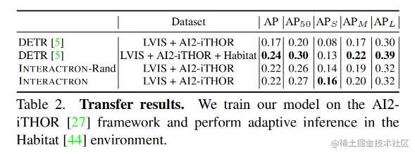 表2展示了在 AI2-iTHOR 图像上训练的 INTERACTRON 的性能几乎与在 Habitat 中经过全面监督预训练的检测器相当。