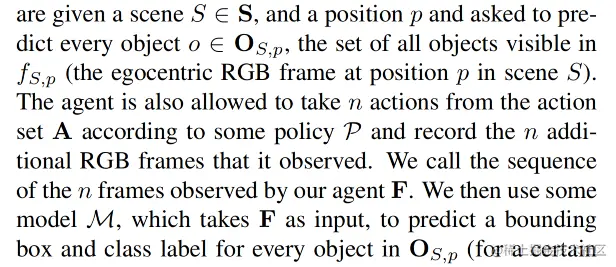 首先介绍了一种新的目标检测任务,它适用于交互环境 (如 AI2-THOR 或 Habitat)。该任务包括为具体代理的以自我为中心的 RGB 帧中的每个目标检测 bounding box 和类别标签。