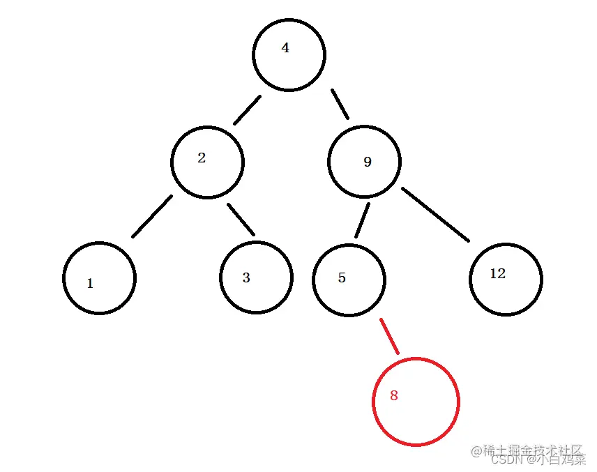 这里的8是我们插入的元素,为什么会放在叶子节点上?是因为我们这个元素要不是比节点小要不就是大(二叉搜索树不可以包含相同的元素)并且不会存在大小相同的元素,那么他就会一直遍历下去寻找要插入的位置直到叶子节点结束(相对于叶子节点要不大就放在叶子右边要不小就放在叶子左边)