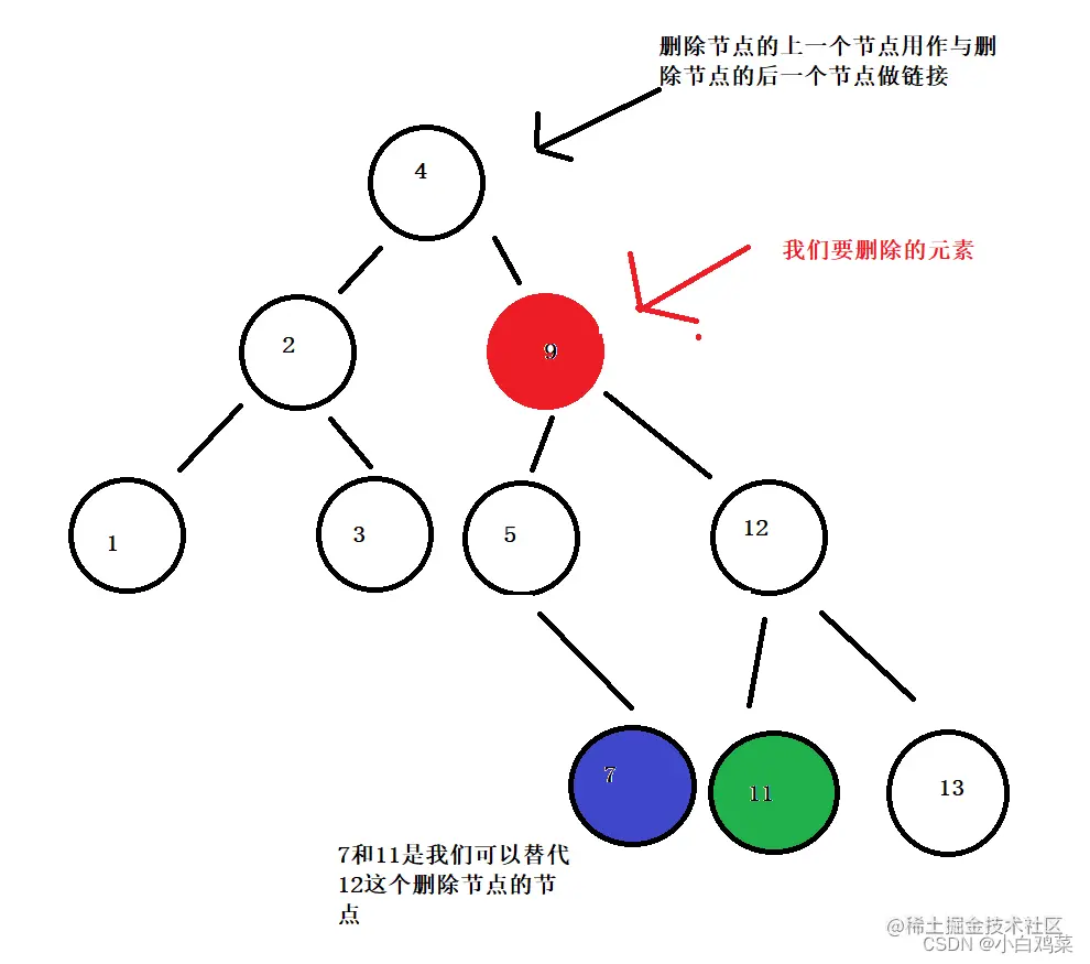 先看7和11的位置。7是 删除节点9作数中最大值的节点,11是删除节点9的右树中最小值的节点。