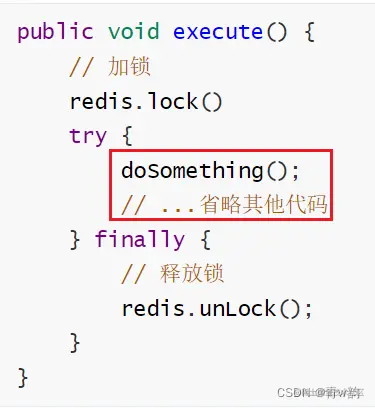 假设机器A-服务A获取到了锁,但是在执行到下图位置时,服务或者机器挂掉了,此时,锁就无法被释放了。其他服务无法获取该锁。