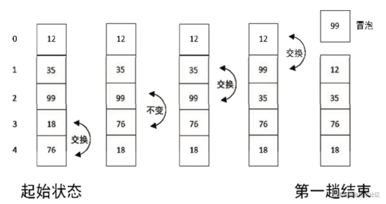 - 从后开始遍历,首先比较 18 和 76,发现 76 比 18 大,就把两个数交换顺序,得到 12、35、99、76、18