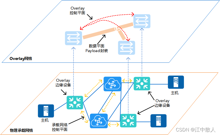 Overlay网络具有独立的控制和转发平面,对于连接在Overlay边缘设备之外的终端来说,物理网络是透明的。