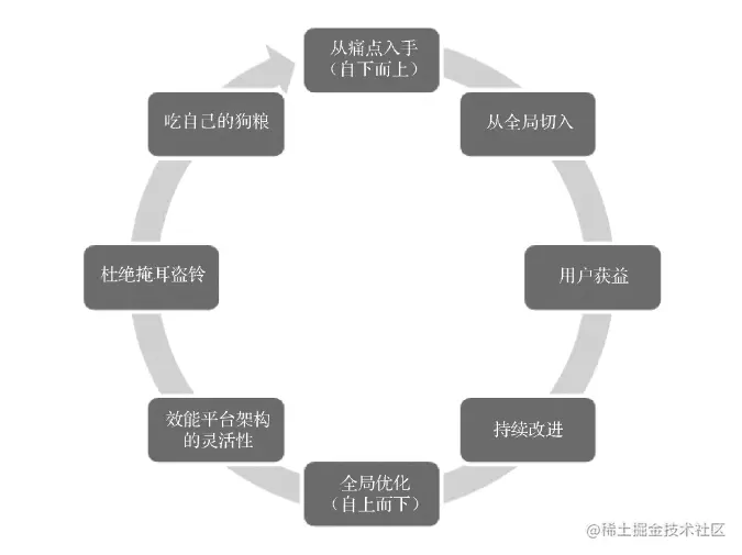 4、持续改进。持续改进是效能平台的必经之路,研发效能团队可以采取「先圈地、后改进」的策略。