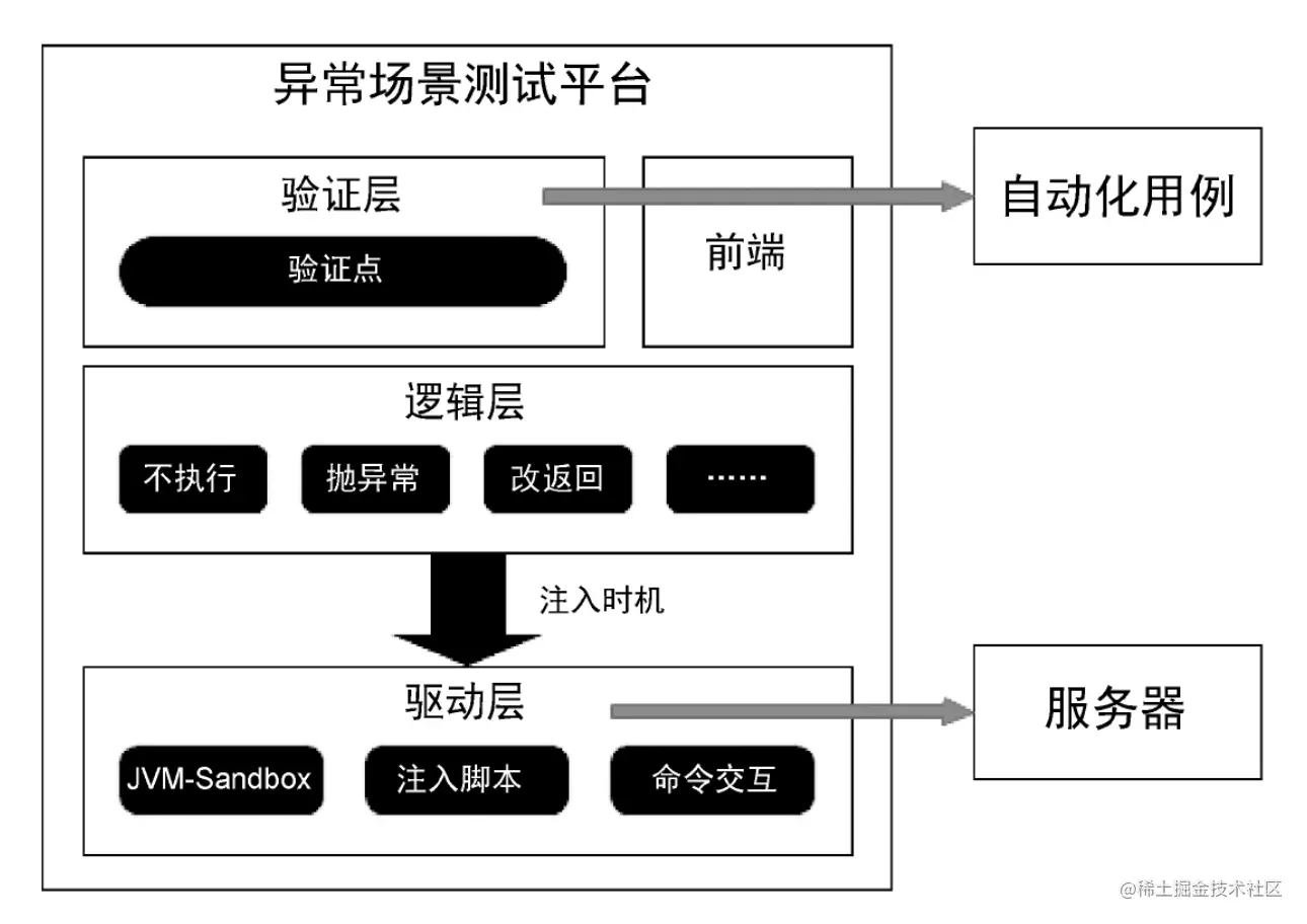JVM-Sandbox 提供了便捷的异常场景接入能力,具体实现需要梳理场景、安装工具、注入脚本等,一种更好的方案是将这些功能封装做成一个异常场景测试平台。该平台可以分为驱动层、逻辑层、验证层等三层,多数情况用户只要在验证层填入需要验证的节点就可以完成测试任务,大大降低使用门槛。整个平台大概的架构如下所示: