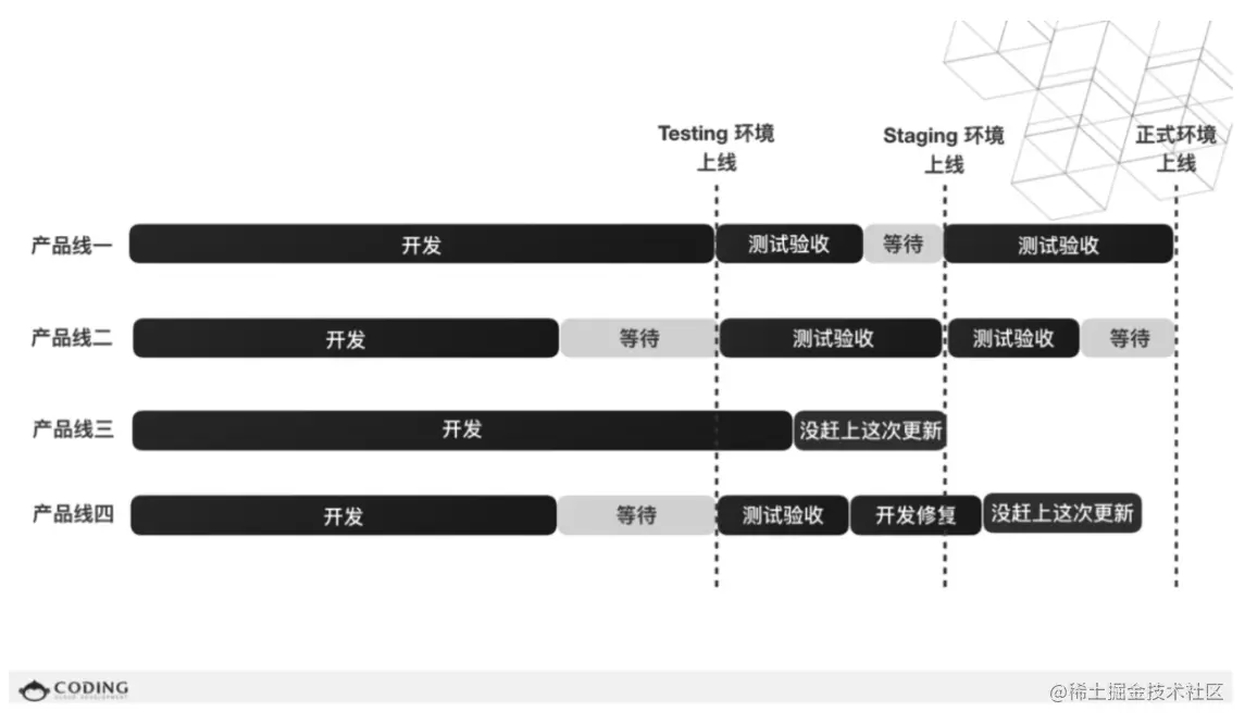 但它存在一个问题就是,各个产品线都有独立的产品经理、设计师和研发人员,但需要共同的运维人员协助部署测试环境,再统一验收,这中间会空出大量的等待时间。对应的解决方案有两个:
