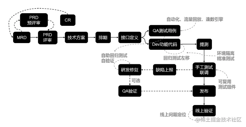 为了提高交付速度就需要解除前置依赖,比如测试流程,测试人员依赖开发人员的代码提交,如果解除依赖,由研发人员提前完成回归测试,确保没问题后再提测,这就是「回归前置」的概念。初次之后还有一些手段: