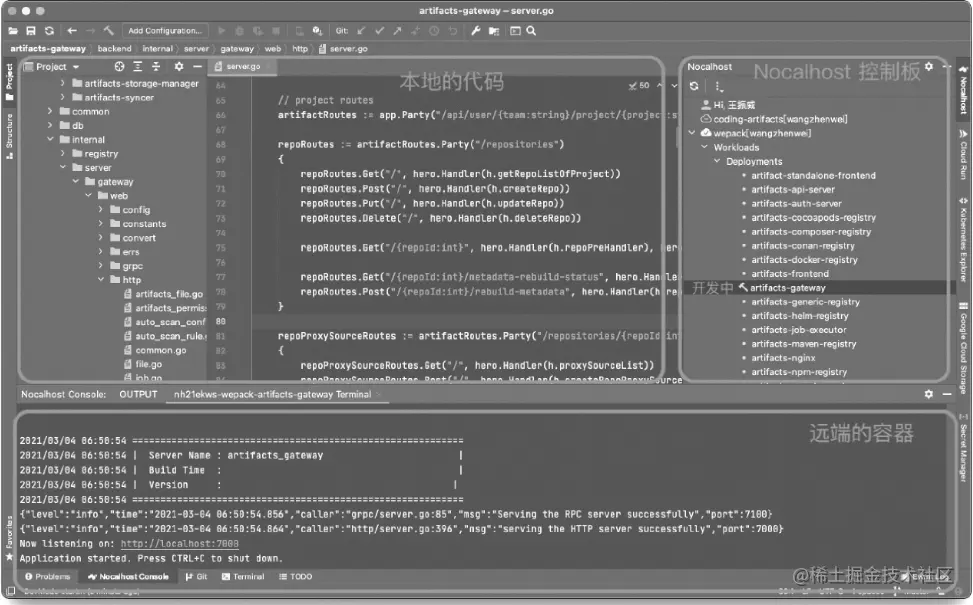 随着产品线不断增多,公用的测试环境、测试配置带来的不稳定就趋于明显。为了解决这些问题,CODING 团队自研了 Nocalhost,它可以在 Kubernetes 上快速部署、开发和调试。研发人员可以在本地体验微服务切换、IDE 直连集群、热重载等功能。研发人员在开发过程的得到的反馈循环从 5 分钟缩短到 1 秒。