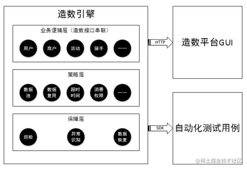 去QE化并非不要测试,而是将测试任务转移到开发人员身上,这样的好处是缩短开发->测试-> 修复问题这条路径周期,但它带来的挑战也不小,一个是开发一般不具备测试人员的「破坏性思维」,对自己的代码判断不客观,另外大量的测试数据、多样的测试环境、多种测试框架,这些对开发来说也都是一种负担。能有效解决这些问题才是去QE化的前提,以下是某电商公司践行测试服务化理念所构建出来的测试架构设计。