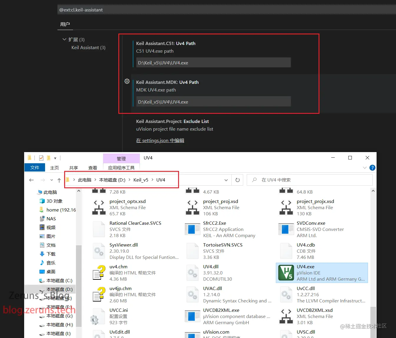 添加keil的可执行文件的路径,这里有两个路径,上面是C51的,下面是MDK的,你要填自己keil安装的目录,参考下图。我将C51和MDK安装到一起了,所以两个填同一个地址就行,如果是分开安装的就需要分开填。