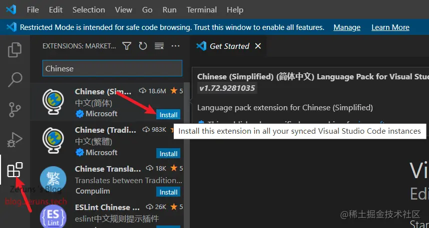 打开vscode点击左边的这个扩展的图标(下图所示),搜索栏输入Chinese,安装第一个扩展插件,安装完后重启vscode就变成中文了。