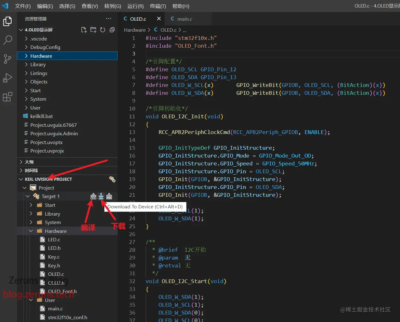 接着就可以用vscode来开发stm32了,下图所示的是编译和下载的按钮。