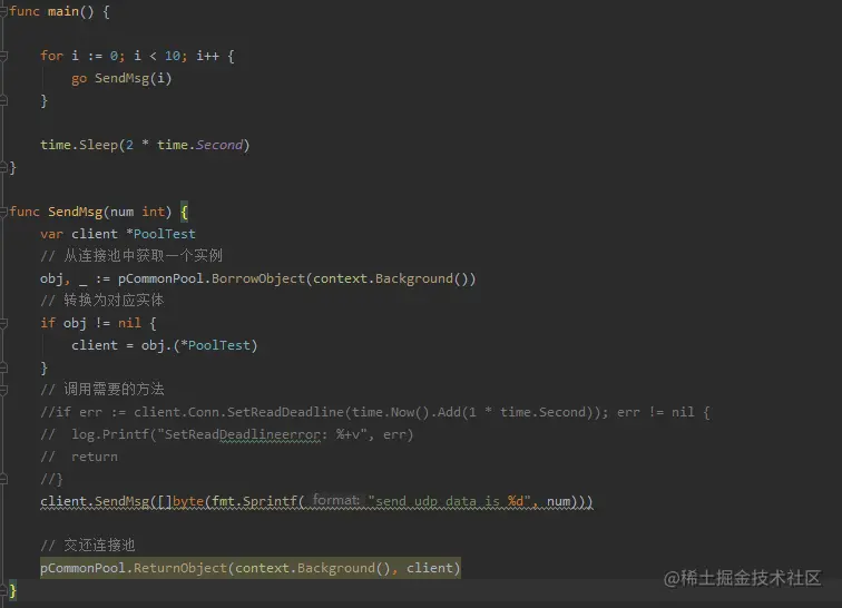 - 其余截图上未体现的 connectUdp(),(this *PoolTest) SendMsg(data []byte) , 和上述自定义池子实现方式完全一致