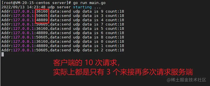 再一次印证了客户端实际上确实只创建了 3 次 udp 句柄