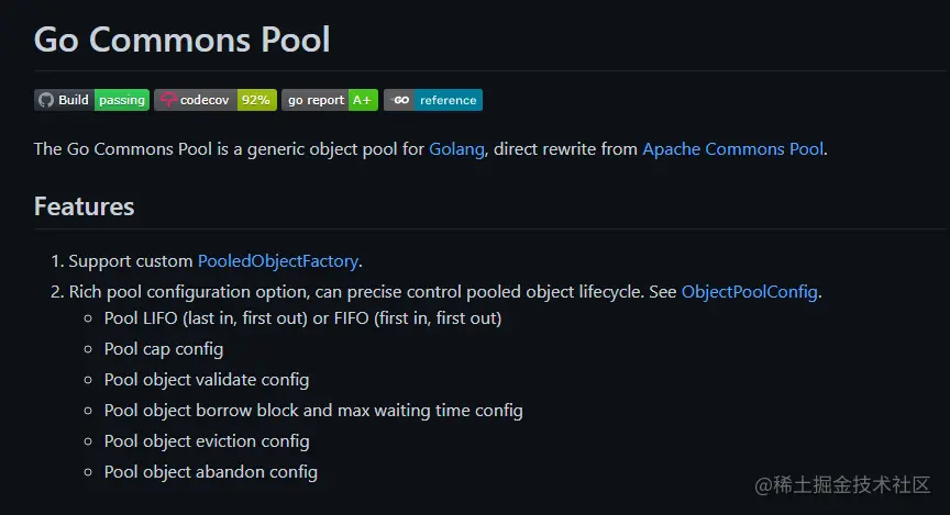 当然,我们大致知道连接池基本是都有哪些组成部分,可以如何玩之后,我们来应用一个 golang 通用的连接池 go-commons-pool, 源码地址为:github.com/jolestar/go…