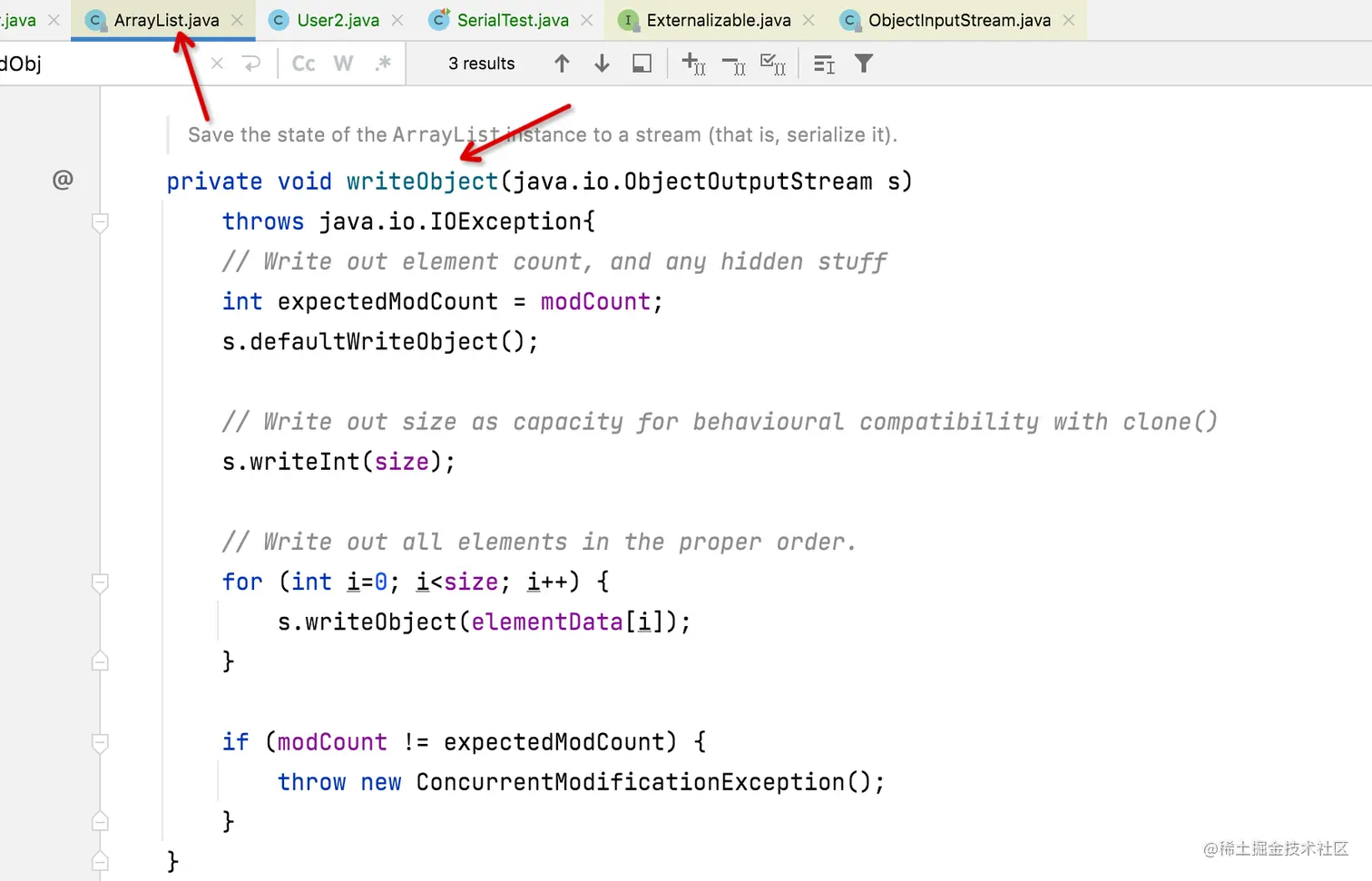 本例我们举个jdk中的例子,ArrayList就实现了这两个方法,重写了序列化机制。