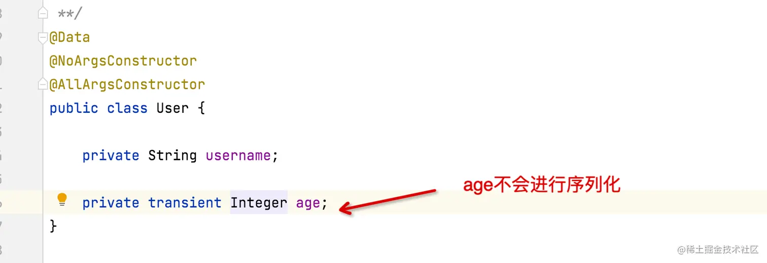 将成员变量标记成transient,那么在序列化的过程中这些数据域会被跳过,如下图所示: