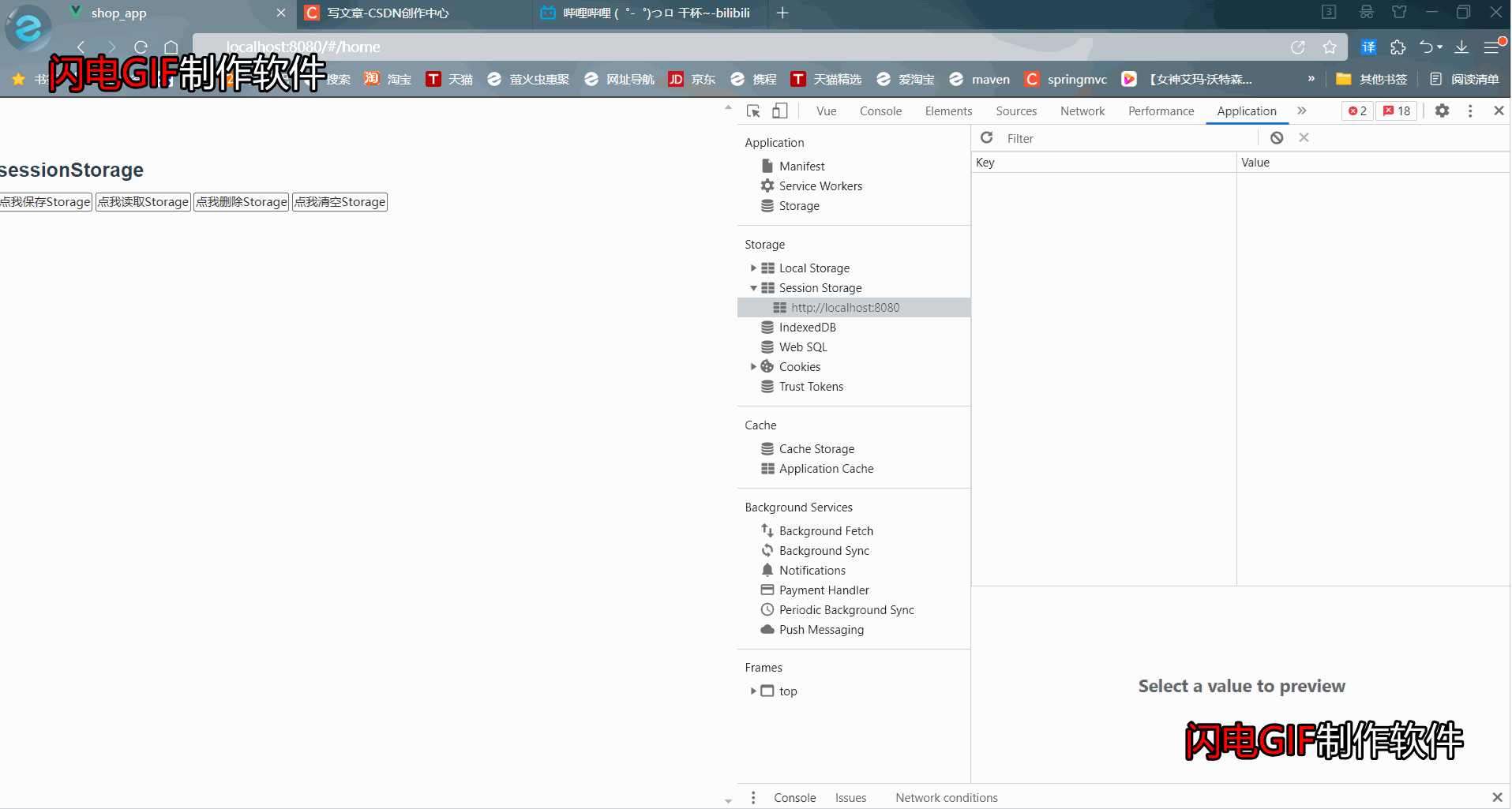 注:会话存储与上面的本地存储使用方法完全一样,只需要将localStorage替换成sessionStorage即可