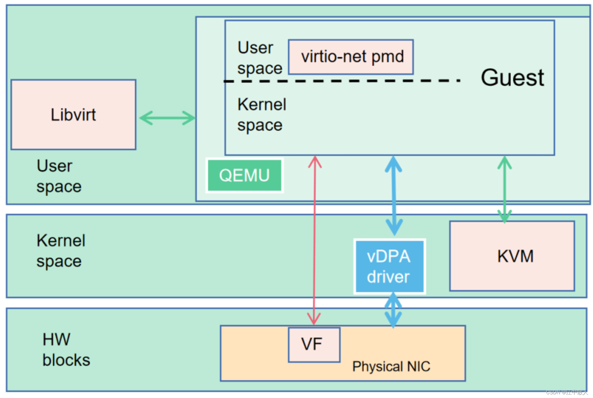 - vDPA(硬件) 是virtio的半硬件虚拟化实现。该框架由Redhat提出,实现了virtio数据平面的硬件卸载。控制平面仍然采用原来的控制平面协议,当控制信息被传递到硬件中,硬件完成数据平面的配置之后,数据通信过程由硬件设备(智能网卡)完成,虚拟机与网卡之间直通。中断信息也由网卡直接发送至虚拟机不需要主机的干预。这种方式,控制面比较复杂,硬件难以实现。