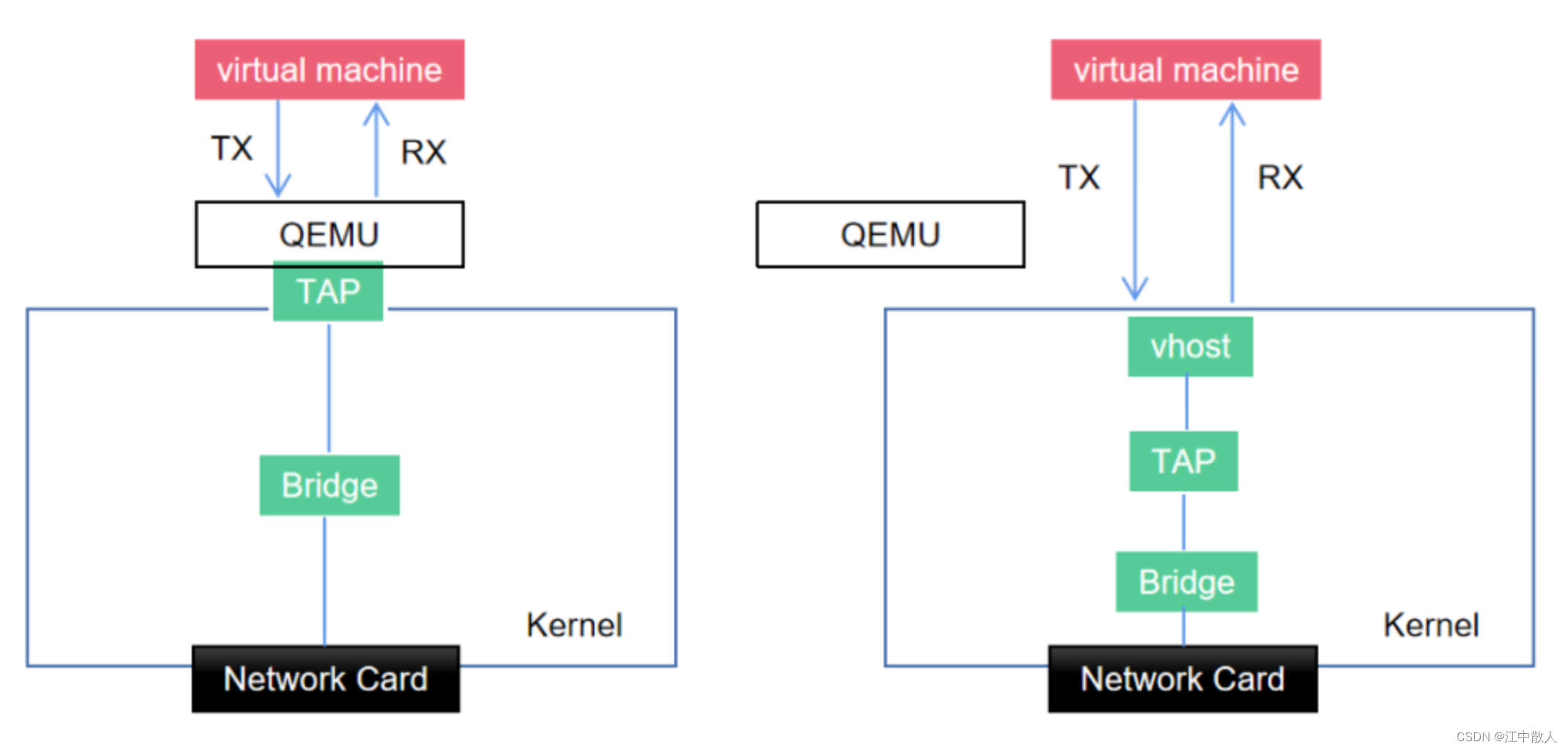 - 在单次收发的过程中,数据通道减少了两次用户态与内核态的上下文切换过程。实现了数据通道在内核态的卸载。Vhost-net作为virtio的backend,与虚拟机内部的virtio NIC通过共享内存方式通信。