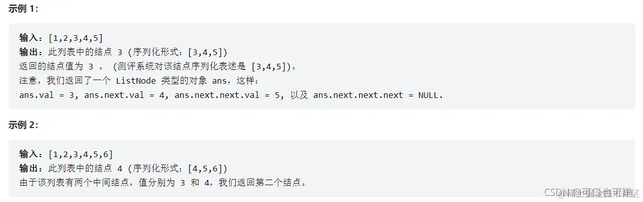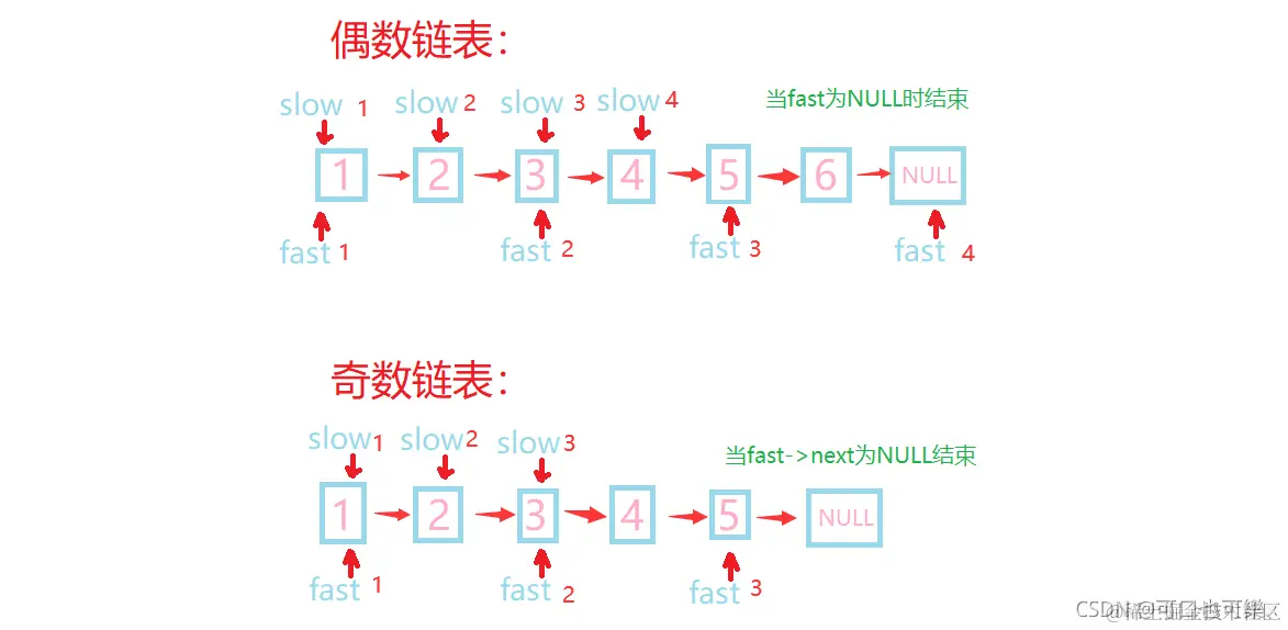 //节点为双数时,快指针走到尾节点的下一个节点NULL(fast为NULL则停止)