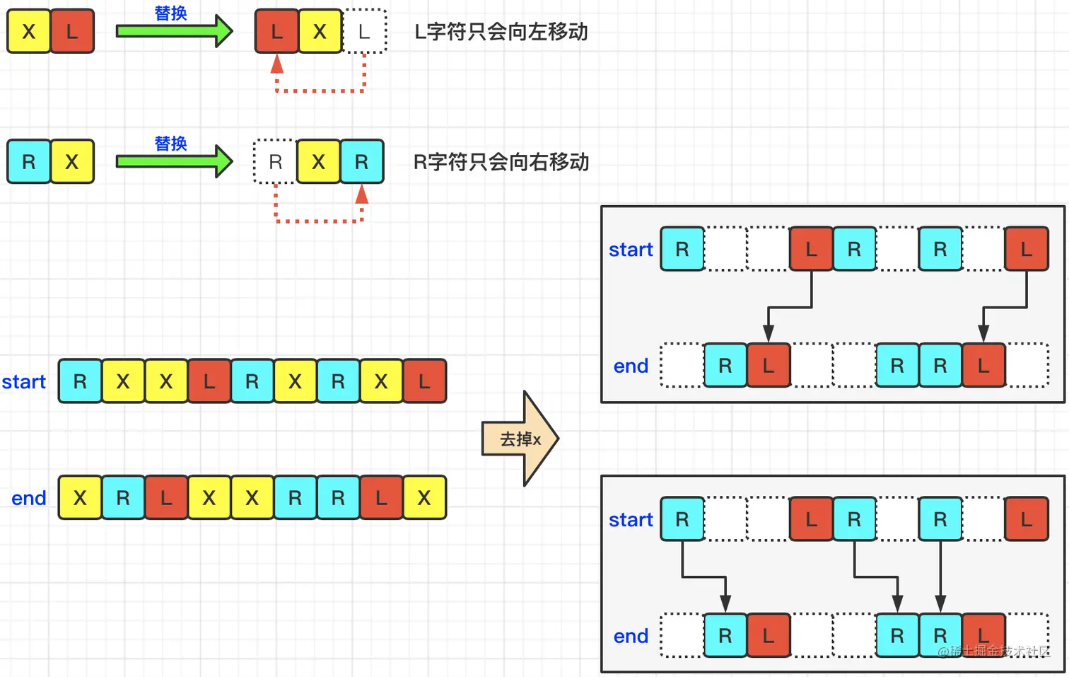 根据题意,我们可以知道“LX”可以替换为“XL”,“XR”可以替换为“RX”,所以,我们可以将其看成是X位置不变(即:以X为“轴”),去移动字符'L'或者'R'。那么根据题目描述的变化规则,'L'是只能向右侧移动,即:“LX”——>“XL”;'R'是只能向左侧移动,即:“XR”——>“RX”;