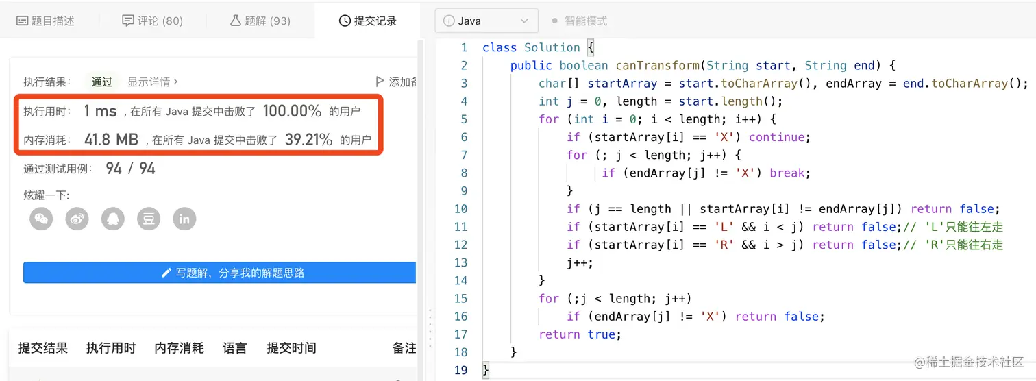 在一个由 'L' , 'R' 和 'X' 三个字符组成的字符串(例如"RXXLRXRXL")中进行移动操作。一次移动操作指用一个"LX"替换一个"XL",或者用一个"XR"替换一个"RX"。现给定起始字符串start和结束字符串end,请编写代码,当且仅当存在一系列移动操作使得start可以转换成end时, 返回True。