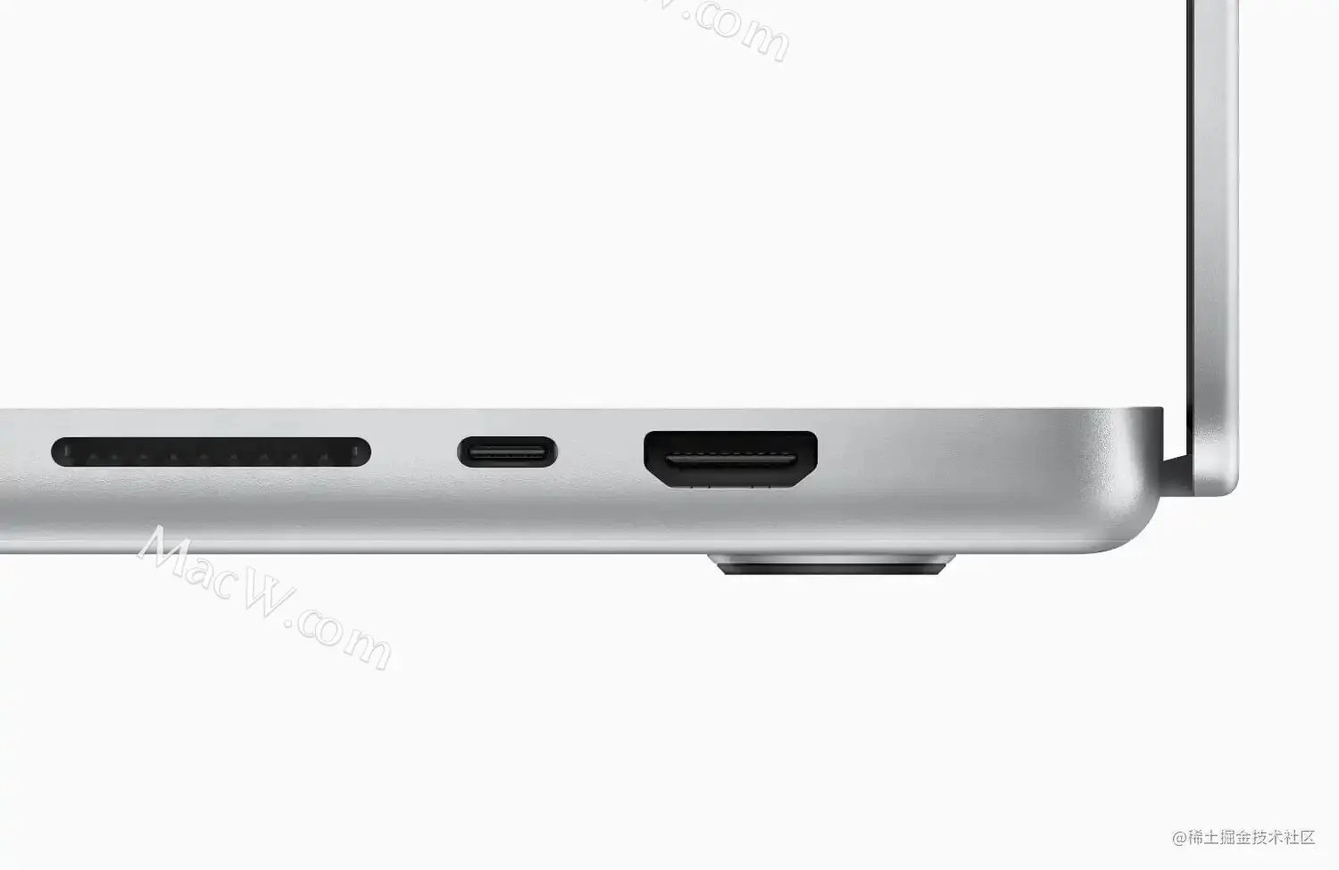 MacBook Pro 配备三个 Thunderbolt/USB 4 端口。Apple 还包括一个 SDXC 卡插槽、一个 HDMI 2.0 端口和一个支持高阻抗耳机的耳机插孔。