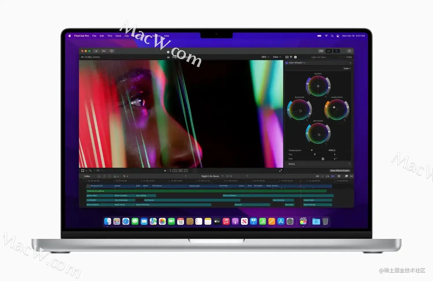 边框(显示器周围的边框)已大大减少,以至于 MacBook Pro 徽标不再位于屏幕底部,而是位于笔记本电脑的底部。显示屏顶部有一个用于 FaceTime 摄像头的凹口,就像 iPhone 一样。Apple 已将缺口与菜单栏的深度相同,因此它不会侵入您的工作区。
