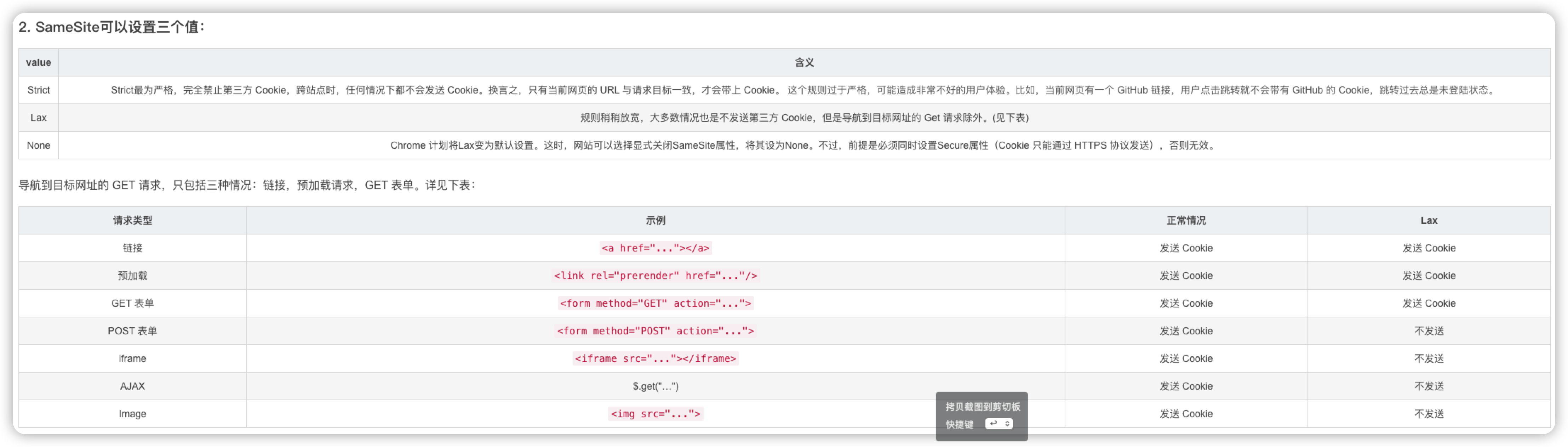 - Lax规则稍稍放宽,大多数情况也是不发送第三方 Cookie