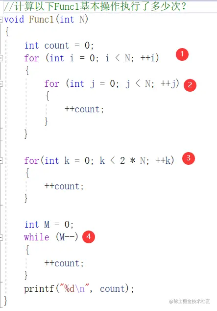 上面的代码中有四个循环,我们现在计算他的执行次数。1和2两个循环是嵌套的,3和4是独立出来的循环。