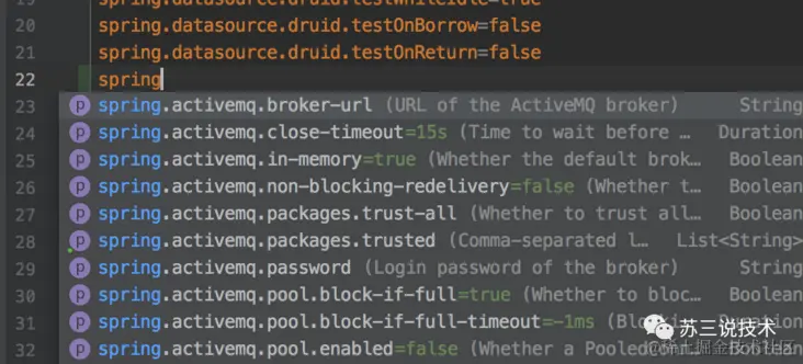 spring-configuration-metadata.json和additional-spring-configuration-metadata.json的功能差不多,我们在applicationContext.properties文件中输入spring时,会自动出现下面的配置信息可供选择,就是这个功能了。