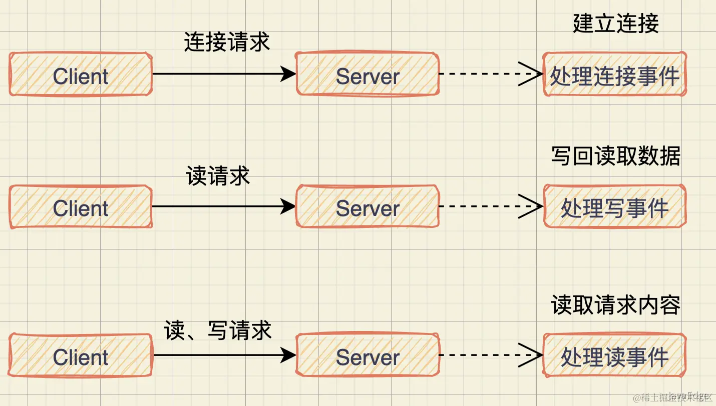 - 三类处理事件,即连接事件、写事件、读事件