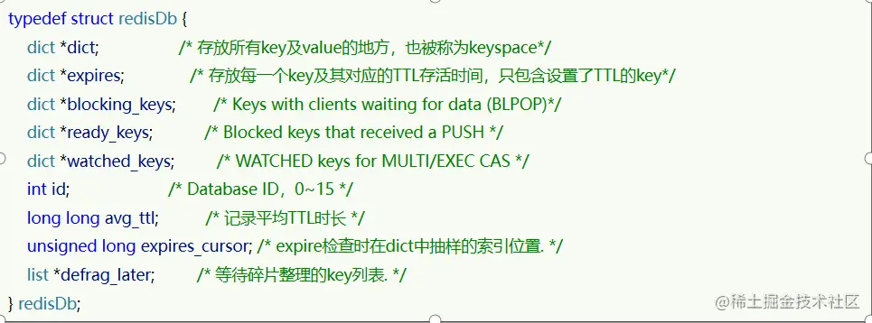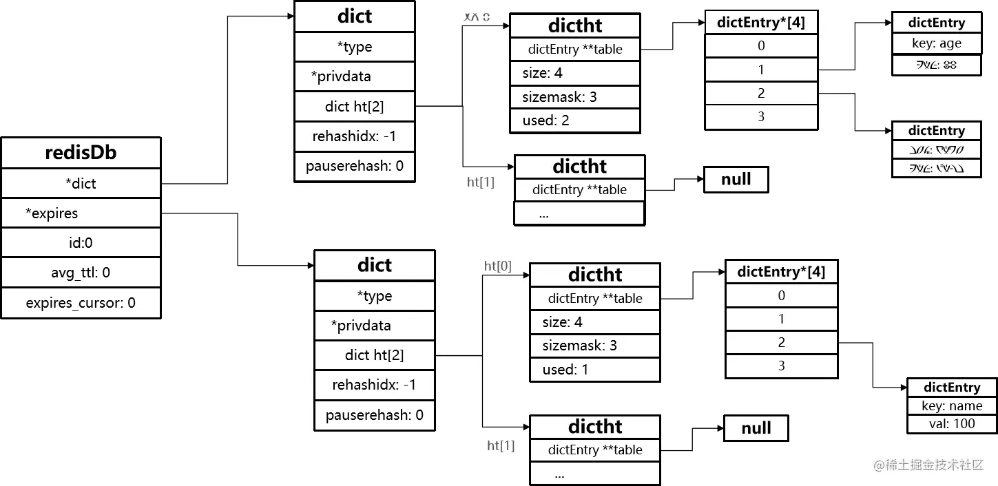 Redis 本身是一个典型的 key-value 内存存储数据库,因此所有的 key、value 都保存在之前学习过的 Dict 结构中。不过在其 database 结构体中,有两个 Dict:一个用来记录 key-value;另一个用来记录 key-TTL。