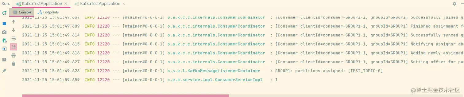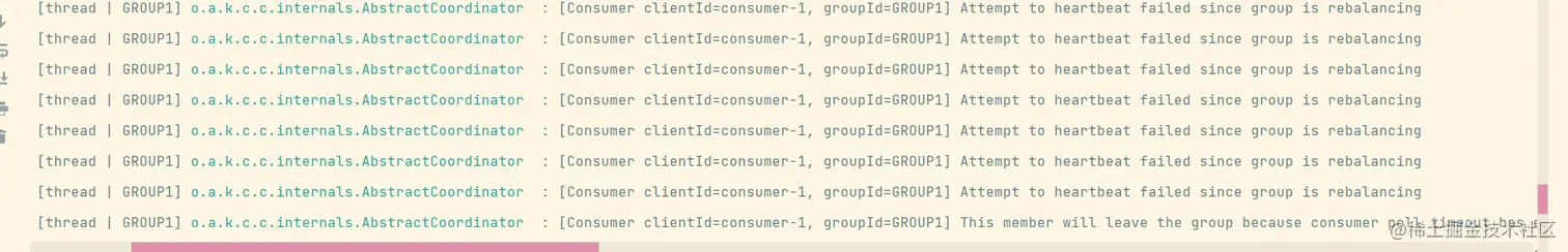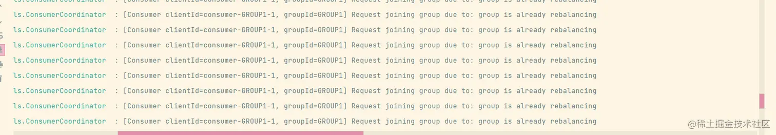 启动成功后,发现第一个消费者大量输出重平衡日志,且重平衡期间数据并没有消费
