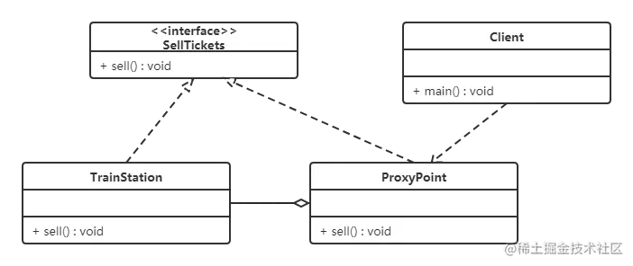 如果要买火车票的话,需要去火车站买票,坐车到火车站,排队等一系列的操作,显然比较麻烦。而火车站在多个地方都有代售点,我们去代售点买票就方便很多了。这个例子其实就是典型的代理模式,火车站是目标对象,代售点是代理对象。类图如下: