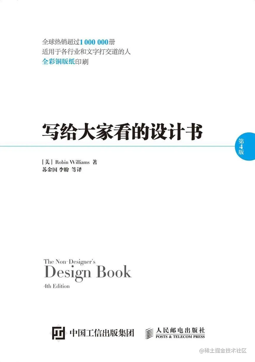如果想了解设计,推荐看这本《写给大家看的设计书》,作者 Robin Williams,世界著名设计师、技术专家、同时也是一名授课老师。作者通过书中很多的示例介绍了设计的法则,这也是她多年来的教学经验。但是并不是说,读完这本书,你就能成为一个设计人员,但是至少在需要设计的时候,你可能会加入一些设计思维,做出更专业、更统一甚至更有趣的成品。