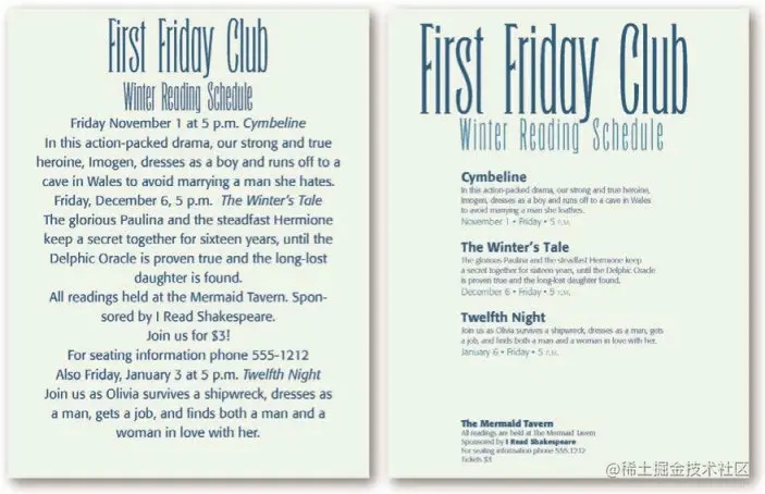 左图密密麻麻,让人很难想看下去;而右图清晰展示了有 3 场读书会,而每个读书会的活动名称都被加粗,一大段空白之后的底部是活动的售票信息和联系方式。