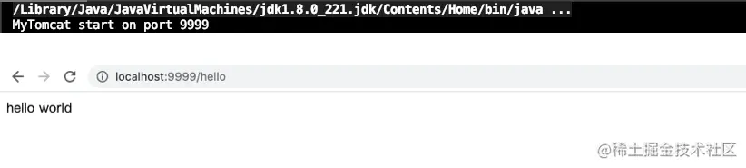 private Map<String, String> url2ServletMap = new HashMap<>(); public MyTomcat(int port) { this.port = port; } public void start() { initServletMapping(); try { // 1. 端口监听 ServerSocket server = new ServerSocket(9999); System.out.println("MyTomcat start on port " + port); while (true) { Socket socket = server.accept(); // 2. 封装Request、Response MyRequest request = new MyRequest(socket.getInputStream()); MyResponse response = new MyResponse(socket.getOutputStream()); // 3. 请求分发 dispatch(request, response); socket.close(); } } catch (IOException e) { e.printStackTrace(); } } private void initServletMapping() { for (MyServletMapping myServletMapping : MyServletMappingConfig.myServletMappingList) { url2ServletMap.put(myServletMapping.getUrl(), myServletMapping.getClazz()); } } private void dispatch(MyRequest request, MyResponse response) { String servletClazz = url2ServletMap.get(request.getUrl()); try { Class<MyServlet> myServletClass = (Class<MyServlet>) Class.forName(servletClazz); MyServlet myServlet = myServletClass.newInstance(); myServlet.service(request, response); } catch (Exception e) { e.printStackTrace(); } } public static void main(String[] args) { new MyTomcat(9999).start(); }}