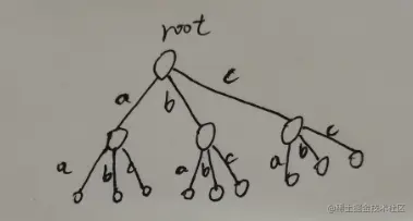 这里每个节点下其实是有26个分支的(当然如果不止英文字母的话可以根据自己的需求设计分支的数量,本文中的是只有英文的,也就26个分支),至于 'a'、'b'、'c' 这些字符是不需要存进节点中的,只要在节点中搞一个节点数组nexts,大小为26,那么 nexts[0]nexts[25] 就分别对应 az