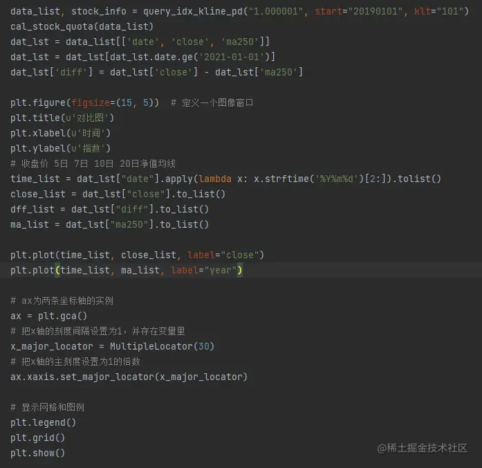 在进行数据获取时,采用东方某富网站上上证指数的 k 线数据,根据 k 线数据计算均线数据,最后将数据进行提取并使用 matplotlib 进行数据展示。