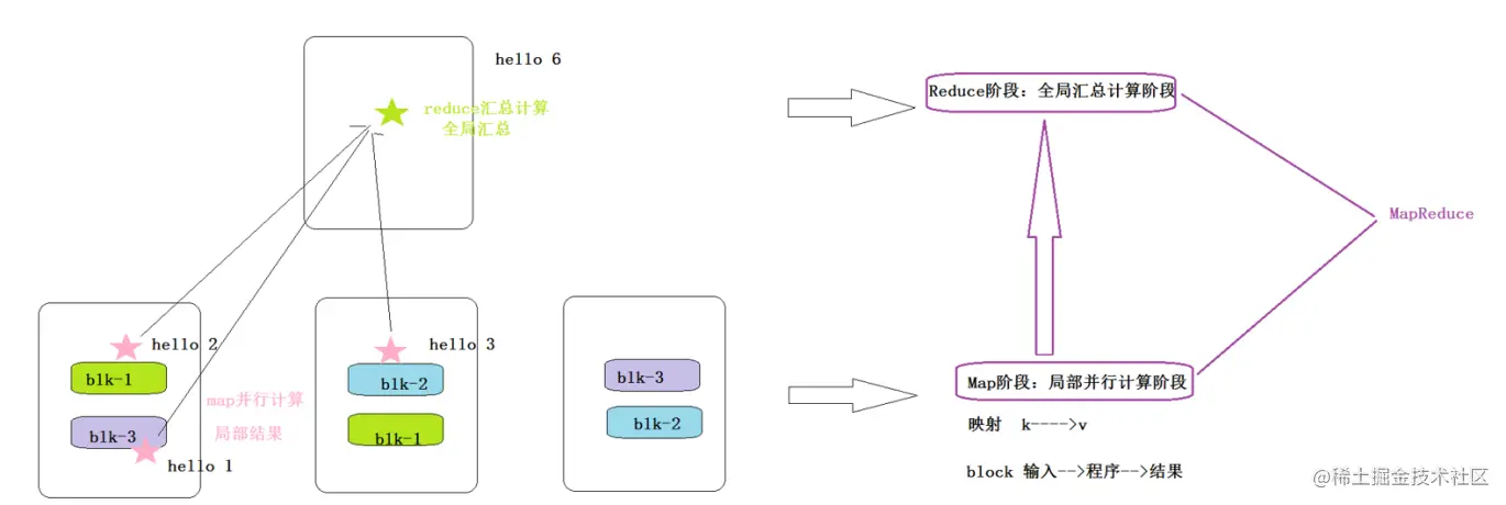 也就是Map阶段分的阶段,把大数据拆分成若干份小数据,多个程序同时并行计算产生中间结果;然后是Reduce聚合阶段,通过程序对并行的结果进行最终的汇总计算,得出最终的结果。