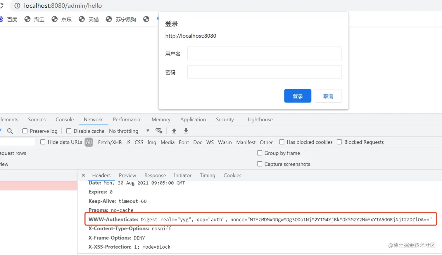 接着来访问一下需要认证的接口,比如/admin/hello接口,这时候会发现浏览器弹出了一个用户名密码的认证窗口。然后我们在浏览器中可以看到HTTP摘要认证信息,realm是我们自定义的“yyg”,qop是默认的“auth”方式。