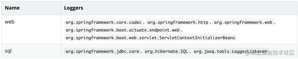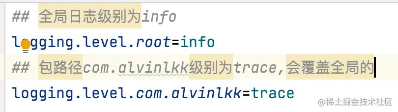 只需要在配置文件中通过 logging.level 包名的形式可以精细化控制各个不同包日志的输出级别,也可以通过logging.level.root全局修改日志级别。日志级别可以配置下面6个: trace < debug < info < warn < error < fatal。